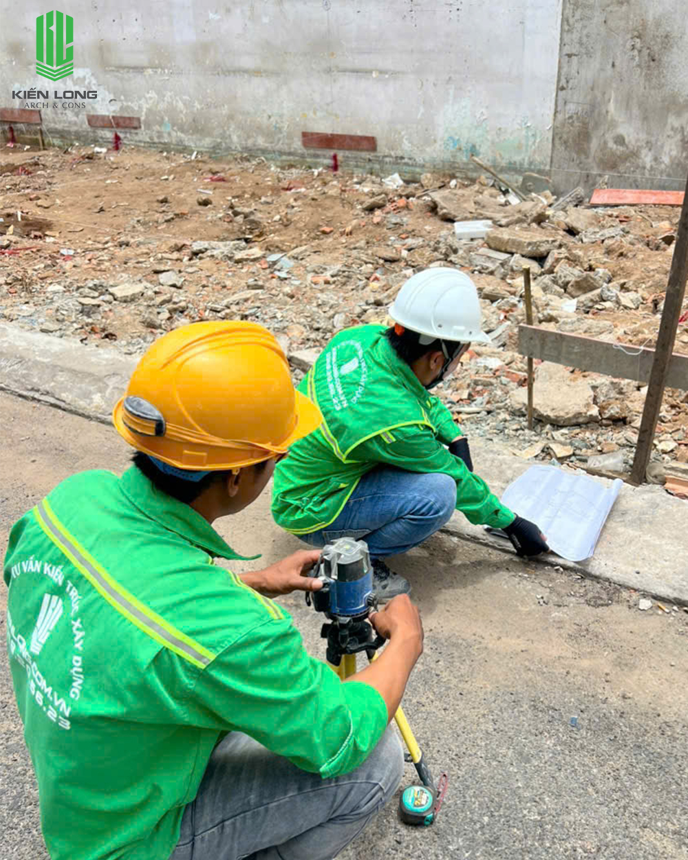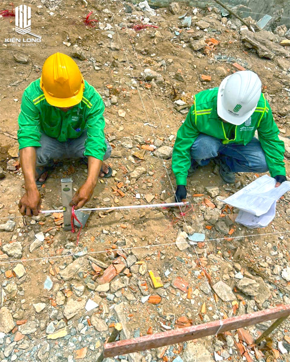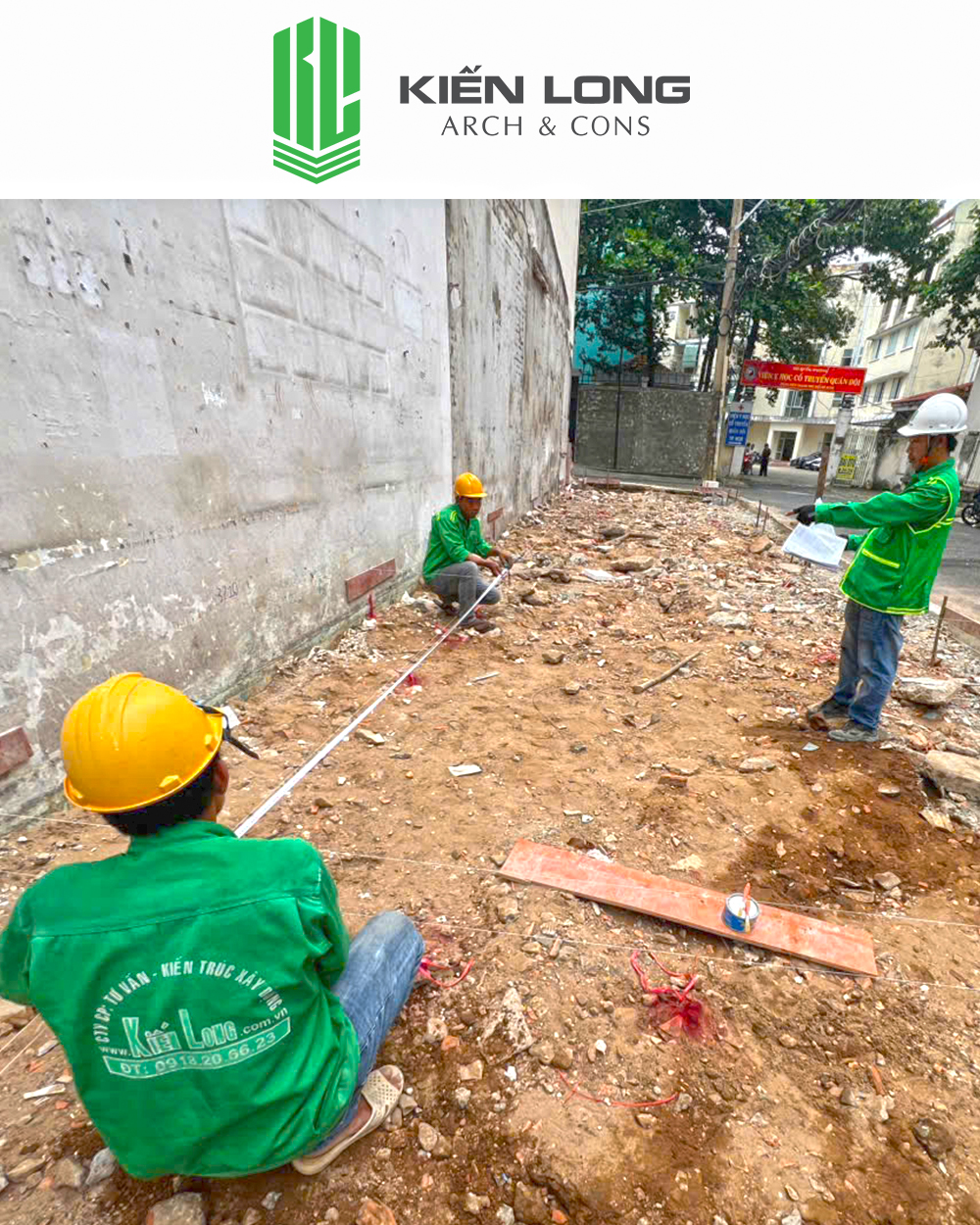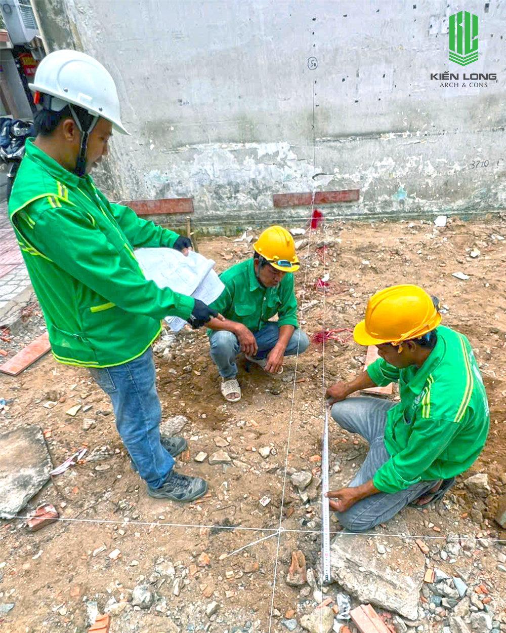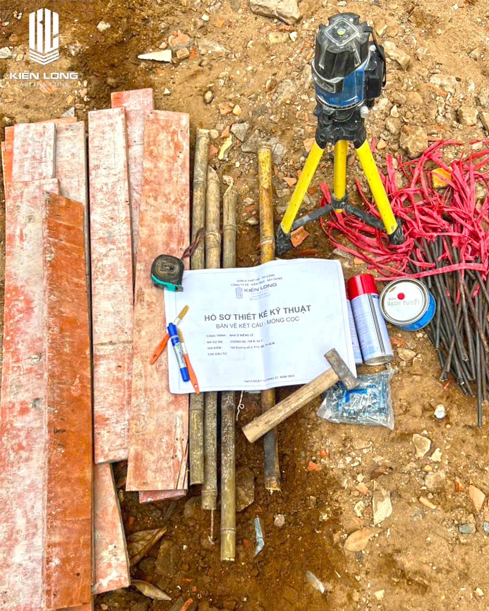 Trên nền đất vừa được dọn dẹp mặt bằng, các kỹ sư Kiến Long sử dụng máy toàn đạc và máy cân bằng laser để xác định các trục chính của ngôi nhà. Việc này cực kỳ quan trọng đối với lô đất góc, nơi các góc cạnh không chỉ đơn thuần là đường thẳng mà phải khớp nối hoàn hảo với ranh lộ giới của 3 mặt thoáng.