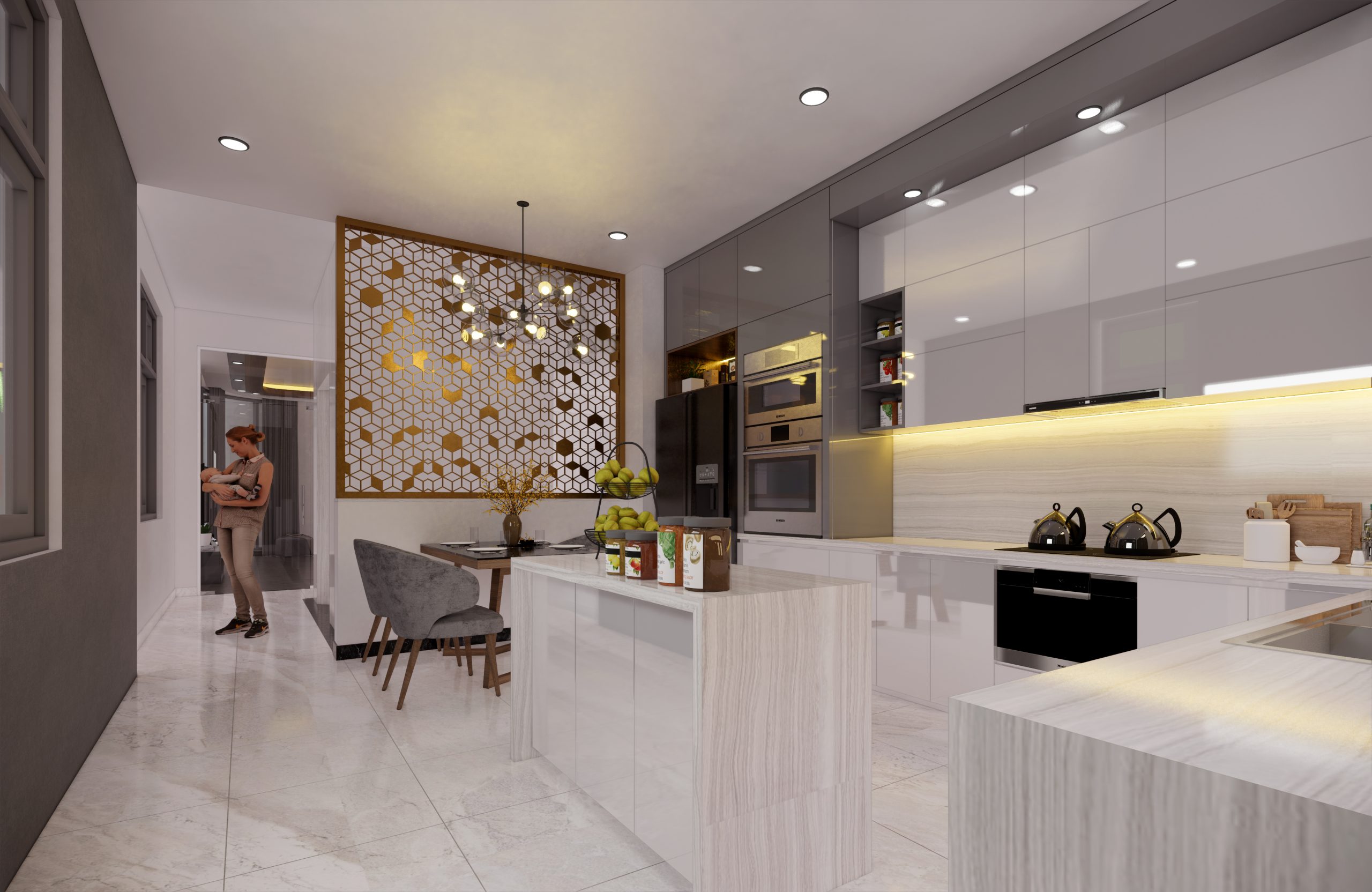 Đặc biệt là không gian bếp. Đây vừa là không gian sinh hoạt chung của cả ngôi nhà. Cũng đồng thời là nơi có rất nhiều mùi từ việc nấu nướng. Nếu không được thiết kế một cách cẩn thận, việc cảm thấy ngột ngạt là điều không thể tránh khỏi. Nhưng đối với Kiến Long, đấy không phải là bài toán khó. Hãy nhìn cách Kiến Long thiết kế không gian bếp cho nhà chú Dân là biết ngay mà.