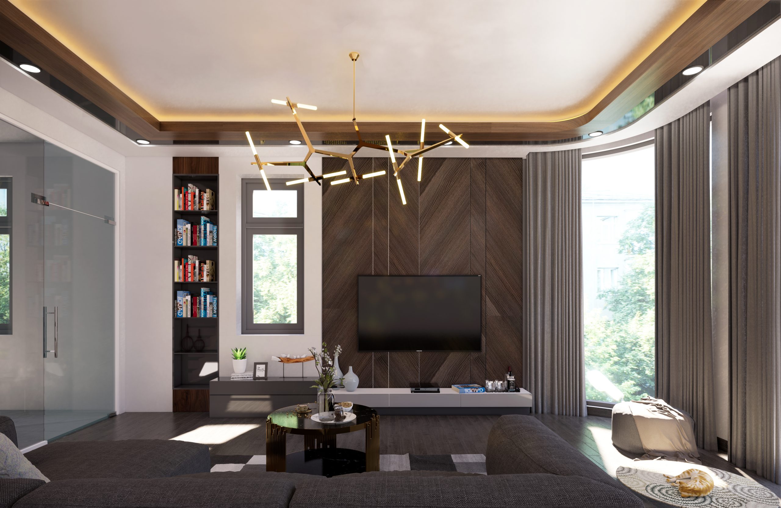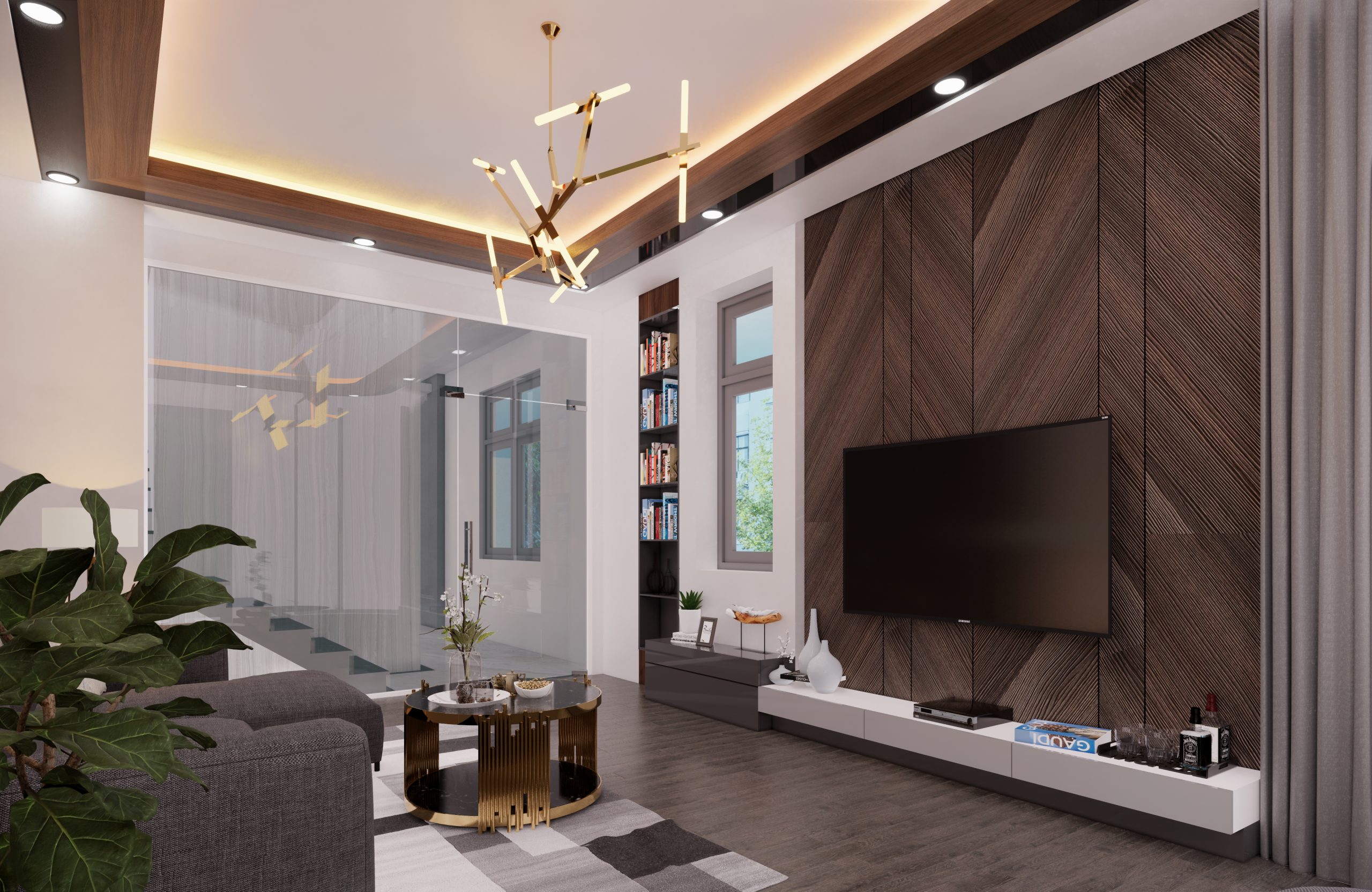 Phòng khách được ngăn bởi lớp kính với không gian bên ngoài. Dụng ý của Kiến trúc sư mong muốn việc giải trí của một thành viên hoặc gia đình trong phòng khách sẽ không làm ảnh hưởng đến những người khác nếu họ đang muốn nghỉ ngơi. Ngoài ra, từ phòng khách cũng có thể quan sát người lên xuống trong nhà. Hơn cả, khu vực cầu thang vẫn sáng sủa chứ không tối tăm như khi bị bức tường ngăn cách.